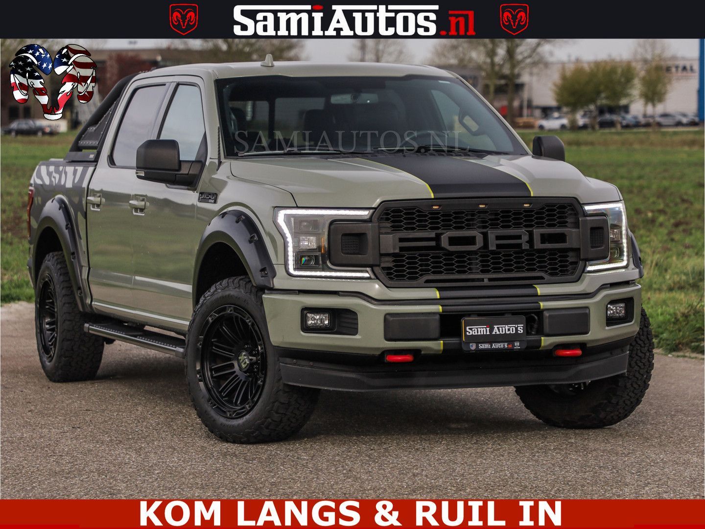 Ford F150 5.0 V8 4X4 | MAT OLIVE GREEN | BIJTELLING VRIJ | ZEER DIK | CAMERA | 3500KG | PANORAMA | LEDER | GO RHINO ROLLBAR | CRUISE CONTROL | PRINS LPG | BAKFLIP COVER | Deze pick-up is leverbaar met zowel een groot rijbewijs (C) als een klein rijbewijs (B). Laat ons weten wat jouw voorkeur is.